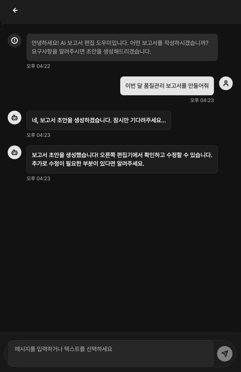 사용자가 “이번 달 품질관리 보고서를 만들어줘"라고 입력합니다.
